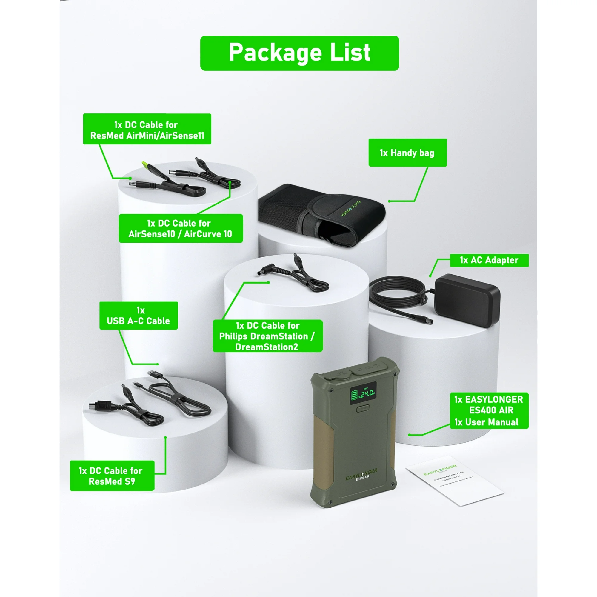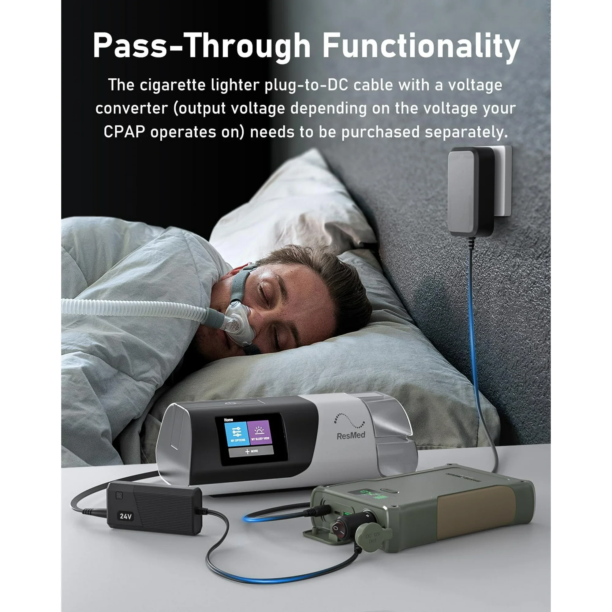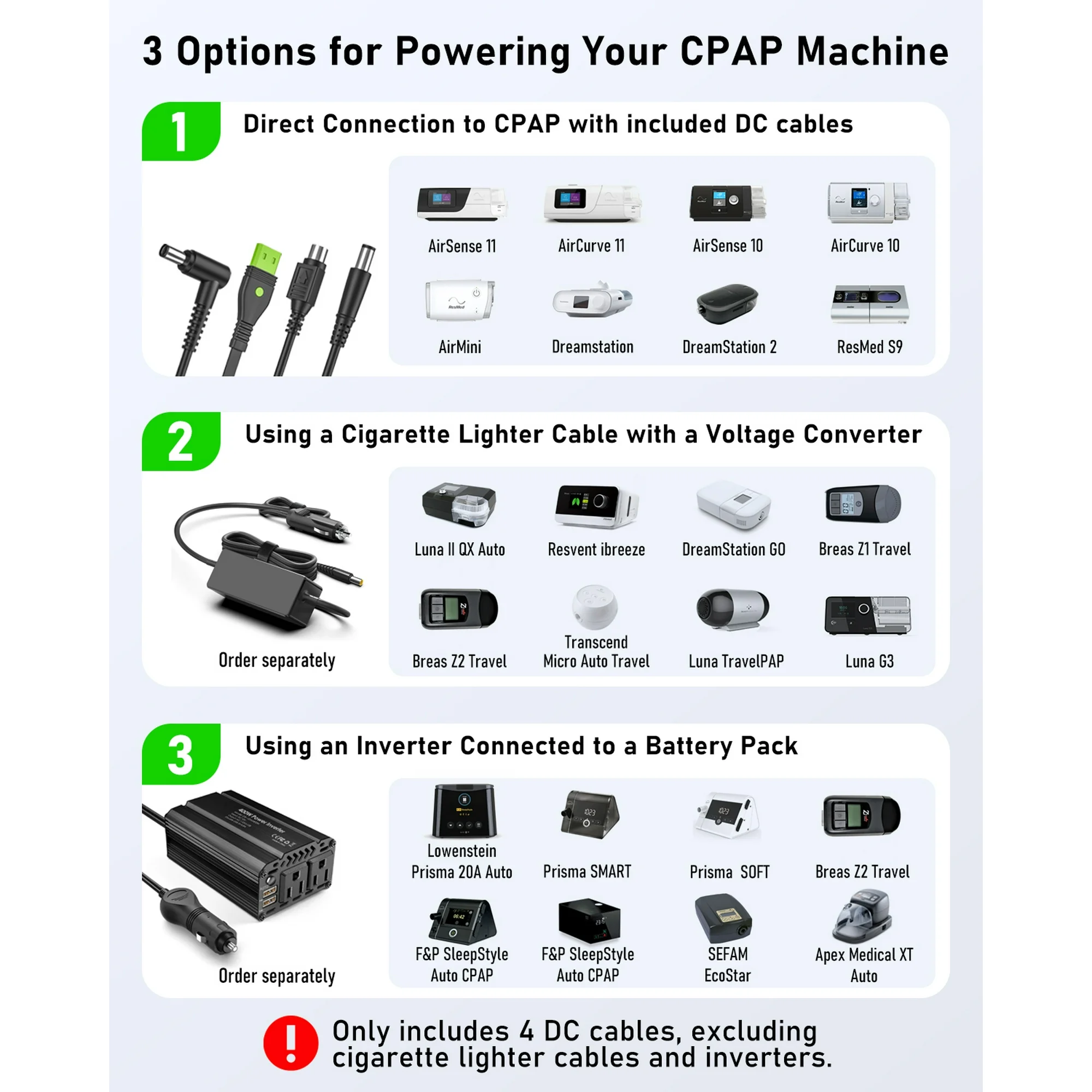 - Broad Compatibility: Includes 4 CPAP-specific DC cables for ResMed AirSense 11/AirCurve 11, AirSense10/AirCurve 10, AirMini, S9, and Philips DreamStation/DreamStation 2.